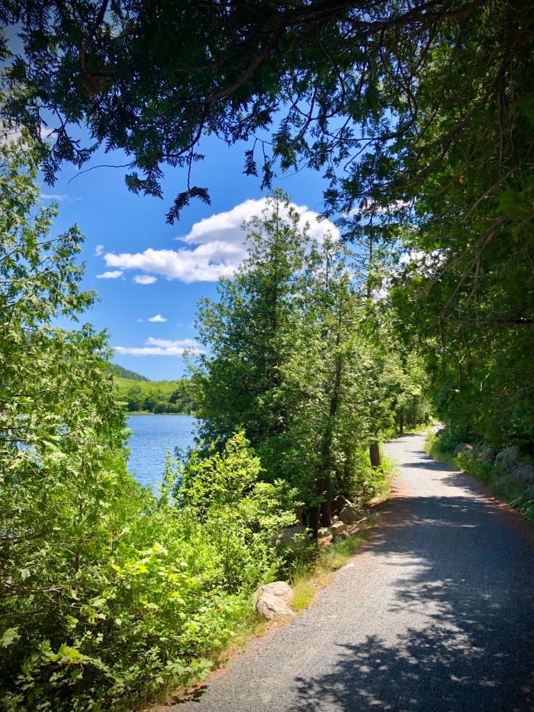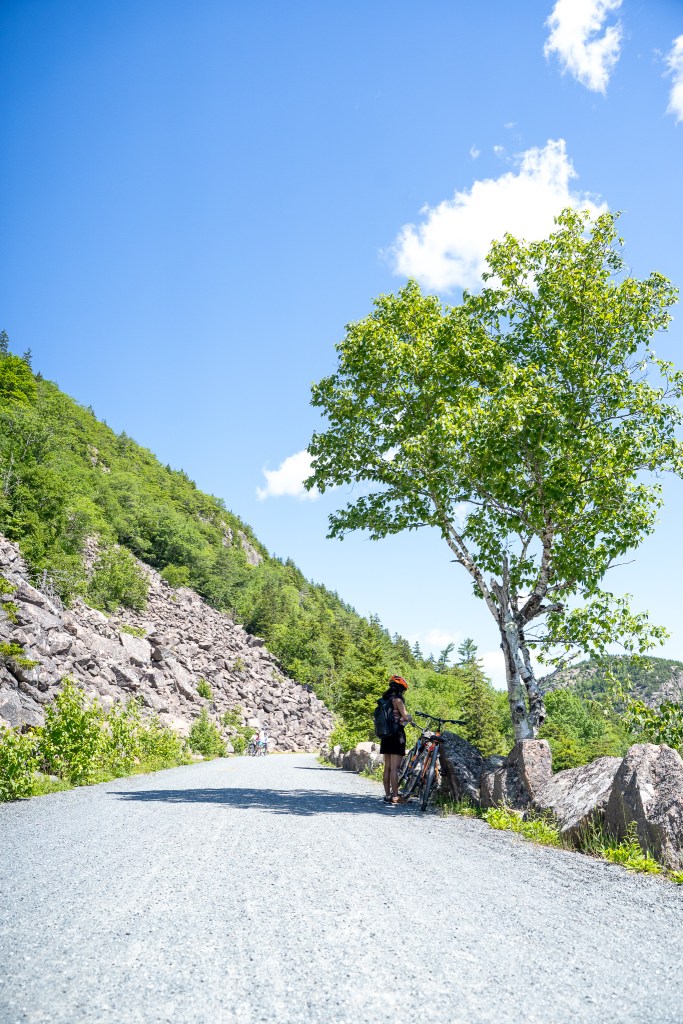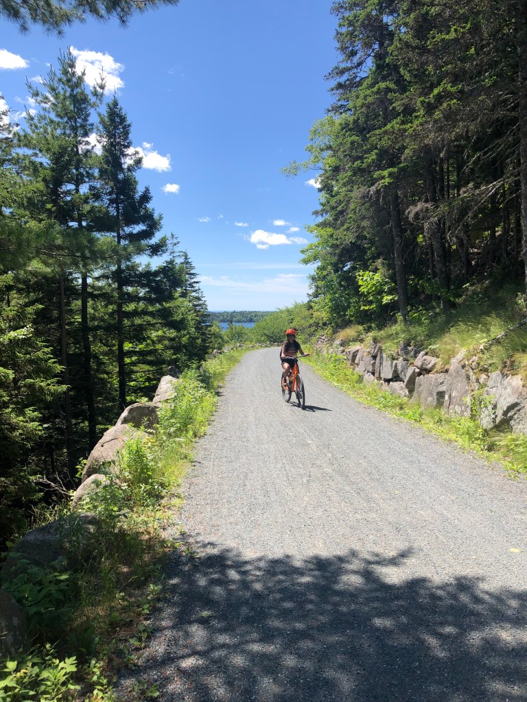 The ride along this section featured stunning views of Jordan Pond on our right. We sometimes crossed a few barren stretches with the occasional tree offering shade for rest. Other times we were riding through the cool forest. The roads are well marked with cedar signs which is great because you won’t need to bring out your phone to get directions.