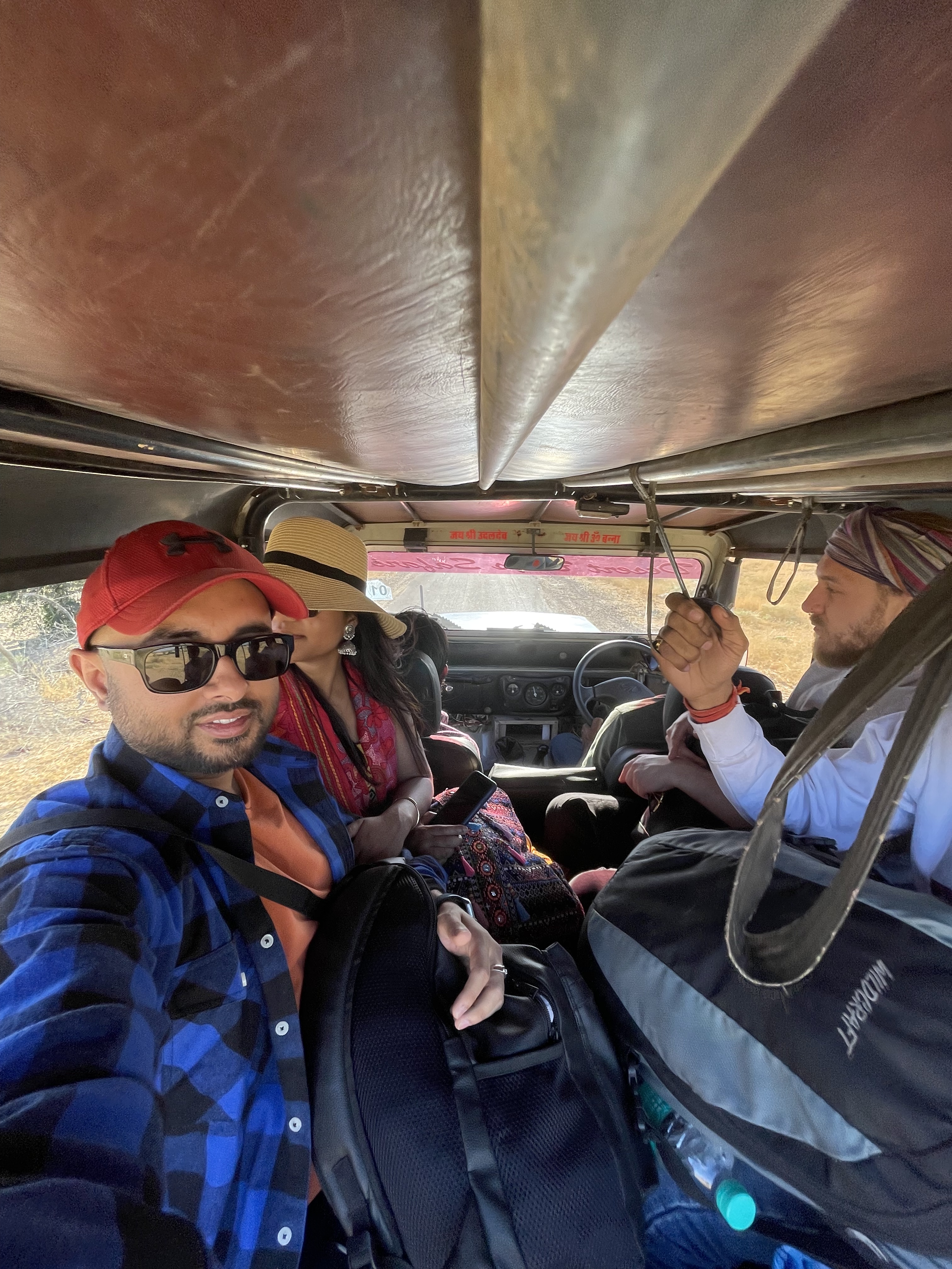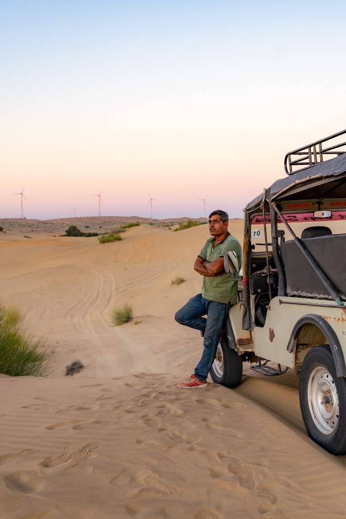 It was about sunset time and our chief tour guide Himmat (which means Courage or Daring 😉) took us on a ride in the Jeep. It was as if Himmat literally transferred half his abilities to the ancient machine which now roared like a lion, swerved on the sand, and cut through 45-degree slopes with ease. The rollercoaster-like ride induced mixed emotions in the panicked passengers, Himmat was amused at their plight. The ride ended with a spectacular view of the sun setting over the dunes.